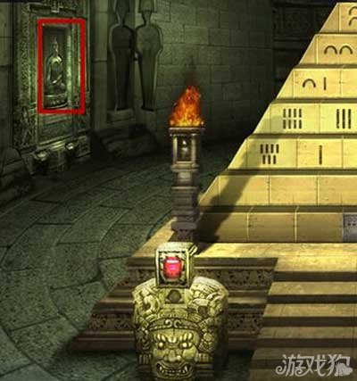 整个游戏中除了这个小佛像之外,就只有左边的墙壁上还有个佛像了。玩家点击左边的墙壁,进入佛像浮雕的界面。