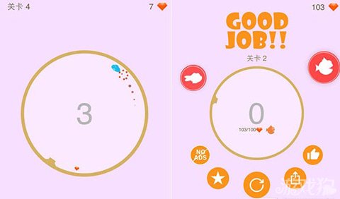 游戏的操作相当简单,当玩家点击开始游戏后,小鱼就会自动沿着圆环逆时针移动,此时玩家点击屏幕,小鱼就会马上折返,变成顺时针移动。圆环内会出现需要玩家去收集的钻石,每一关所需要收集的钻石数,就是那一个关卡的序号,比如第三关中需要玩家收集三个钻石才能通过,而第十关则需要玩家收集十个钻石才能通关。