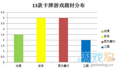 其中动漫题材有2.5个是因为我们将《我叫MT》和《我叫MT国际版》合起来算了1.5个。因此可以看出,中国的卡牌游戏题材选择也很狭隘,13款游戏全都集中在仅仅4种题材中。