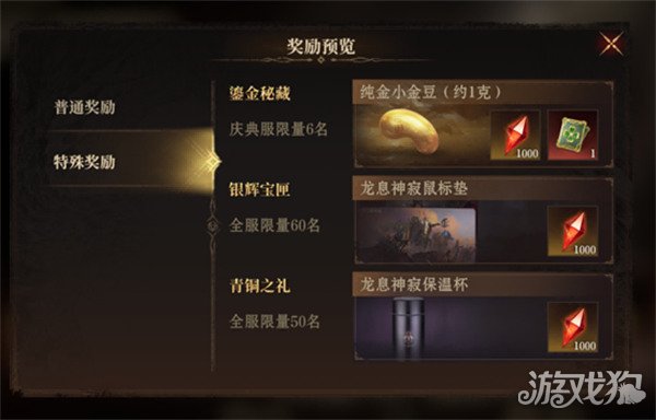 作为本次庆典的重头戏,【涌金之地】服务器将为旅者们提供更加丰厚的福利反馈。在该服务器开启庆典礼盒,除了常规奖励外,还有概率获得全服仅限6份的鎏金秘藏礼包,其中包含1克黄金豆实物奖励。获得此大奖的旅者们将触发全服公告,并获赠永久限定称号【幸运之子】,以资纪念。