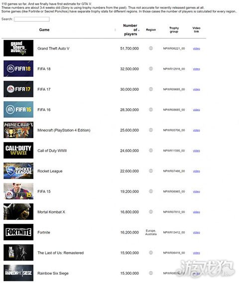 gamestat.com专门汇总了这些索尼意外曝光的数据,列出了110个通过这样计算得到的许多PS4作品玩家数,值得一提的是数据有3-4个星期的延后,其使用的数据似乎来自11月20日和12月4日之间,因此该网站上最新发行的游戏玩家数据并不一定准确。