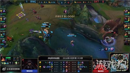 RNG这波依旧是双TP套路想要帮助自己的边路建立优势。8分钟,在看到SKT波比用掉了TP之后,上路布隆直接闪现大招留住轮子妈和索拉卡之后妖姬果断TP上路击杀了索拉卡拿下FB,但随后蜘蛛就绕后双杀了滑板鞋和布隆。