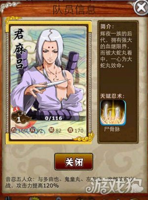 在我们8090《忍者部落》游戏中他自带忍术“尸骨脉”,他与多由也、鬼童丸、左右近、次郎坊一起出战攻击力提高120%;与大蛇丸一起出战攻击力提高15%;与四代风影一起出战攻击力提高20%;装备最强之矛攻击力提高15%;装备咒印模式防御提高20。