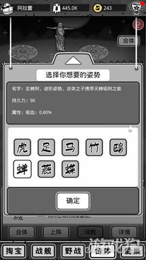 合体时最好选用一种姿势,每一种姿势都有一种特殊的属性,或者减甲,或者吸血,需要哪个就选哪个,但是注意,姿势的属性在同一个娃娃身上是不会叠加的,比如“燕同心”的攻速2%,一个娃娃身上无论你使用多少次燕同心姿势,姿势提供的加成始终都是2%,如果接下来的合体换成了另外一种姿势,那么燕同心的2%也就会消失变成另外一种姿势的属性。