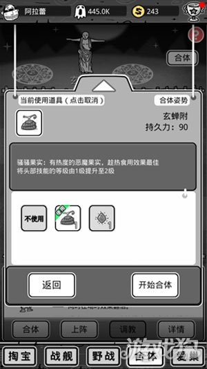 合体的道具是多种多样的,有增加头部技能等级的恶魔果实,也有一些丹药是增加持久力的,还有的道具能几率或者100%合成双头娃娃,所以在合体的时候一定要看清楚,如果是增加基础战力属性的,就用持久力的丹药,持久力越高,合体之后增加的属性也就越高。