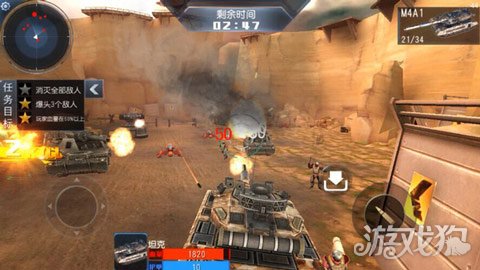 《火力前线》加入了载具作战元素,玩家可以操控坦克和机甲与敌方作战。驾驶载具穿梭在枪林弹雨之中,收割敌方人头,碾碎敌方基地,这种枪战爽快感不言而喻。同时,《火力前线》具有多个超级BOSS关卡,BOSS体型华丽庞大,并具备三个酷炫的主动技能,这样的大家伙可不好对付,玩家需小心谨慎,用操作和智慧战胜它们。