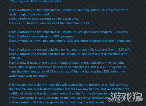 队伍1进攻花村B点,还有3分钟时完全占据。队伍2进攻花村B点,还有0分钟时,在加时完全占据。队伍1重新开始进攻,但他们只占据了20%。这将会是个平局,因为队伍A没有至少拥有1/3的占据百分比,如果队伍1占据了1/3,则他们会获胜。这个改变可能相比目前正式服会有更多的平局(但依然会比更早的版本少)。但我们感觉这会让胜利的时刻更加鲜明清楚,而且防守方也可以进行恰当的玩法上的应对。我们感谢大家的反馈,这个改变会在即将到来的版本中上线。