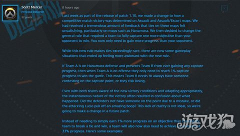 如果队伍1在防守方完美的防守住了2队的进攻,那么当交换攻防后,队伍1在进攻方只需要有1%的占据百分比就可以直接获胜,这意味着2队必须要无时无刻有队员站在点内,否则就可能直接输掉。就算双方队伍都明确清楚这个规则,并且相应做出玩法的应对。这种立刻获胜也会令人迷惑而不知道发生了什么。不清楚到底是自己的失误,还是被对方从点上推开了之类。所以我们决心再次修改规则。现在领先的一方需要至少有1/3的占据百分比才可以获胜。