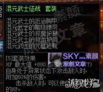 自身异常状态时白字伤害+60%,为了获得这60%的白字,就必须承受五件防具带来的异常状态,混元一套带来的伤害提升还是不少,作为75级的史诗勉强有85级史诗套的水准,但缺点也不多说了,五种异常聚集一身想想就难受,想必现在用这套的玩家是少之又少。