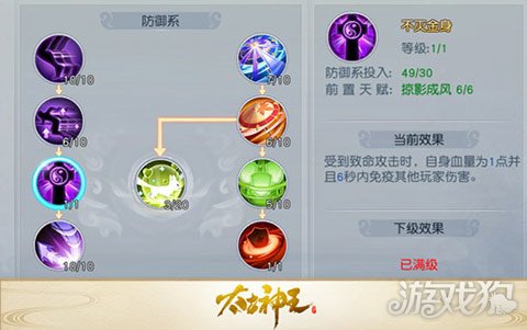 当玩家受到致命伤害时,自身血量为1,并在接下来6秒内免疫一切伤害,冷却120秒,这就是不灭金身的技能描述。解锁它需要30点防御天赋,且前置天赋掠影成风不低于6级。可以说,虽然不灭金身的无敌效果最为拔群,但学习成本也是最高。学还是不学,就要看玩家自己的选择了。
