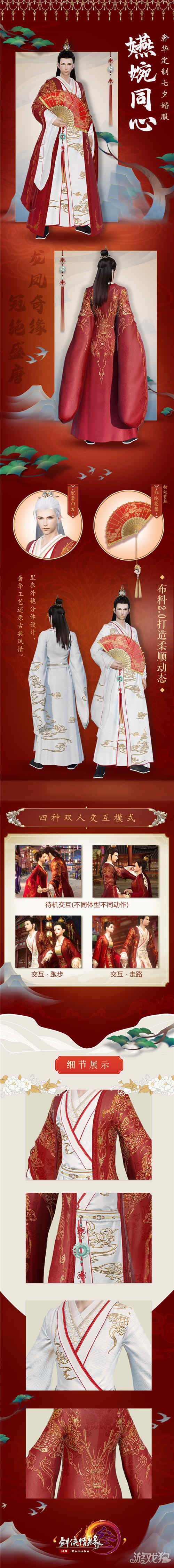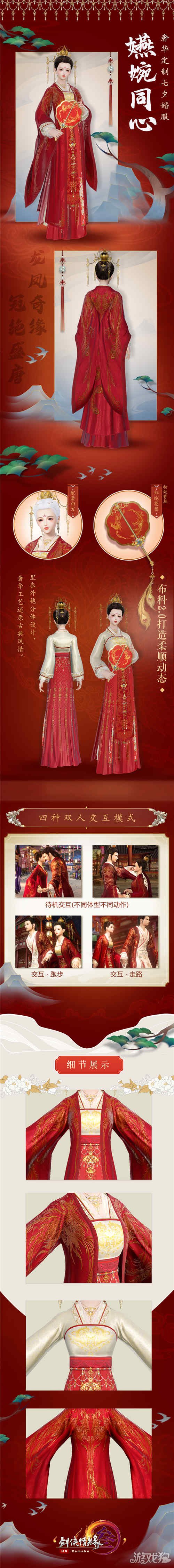 “嬿婉同心”七夕礼盒两种表现形式外观,首款外袍穿搭设计,单衣可独立穿着,侠士可自由切换里衣和外袍的七夕外装,随心搭配最适合自己的七夕风格。特效定制背挂“红纶苍鬓”分男女款单独设计,长安巧匠取纬线棱斜纹金丝彩锦所制,饰以萦回萝草、舞空翔鸾,光影交错间,增丽人容色,添眉目情态,为青年男女却扇之筵所常用。除此之外,“嬿婉同心”七夕礼盒还丰富创新了双人交互的动作主题,主动技不随衣服绑定,穿上衣服自动习得双人牵手技能,两人中只要一套就可施展。值得一提的是,不同体型与不同体型所交互动作也各不相同,每个动作均为该体型量身定制。在对目标使用主动技后进入牵手模式,走路和跑步均为动态交互,另有两种待机小动作,可谓是四倍数的甜蜜!动作暗藏惊喜,爱意满满,诚邀侠士前往实装体验!