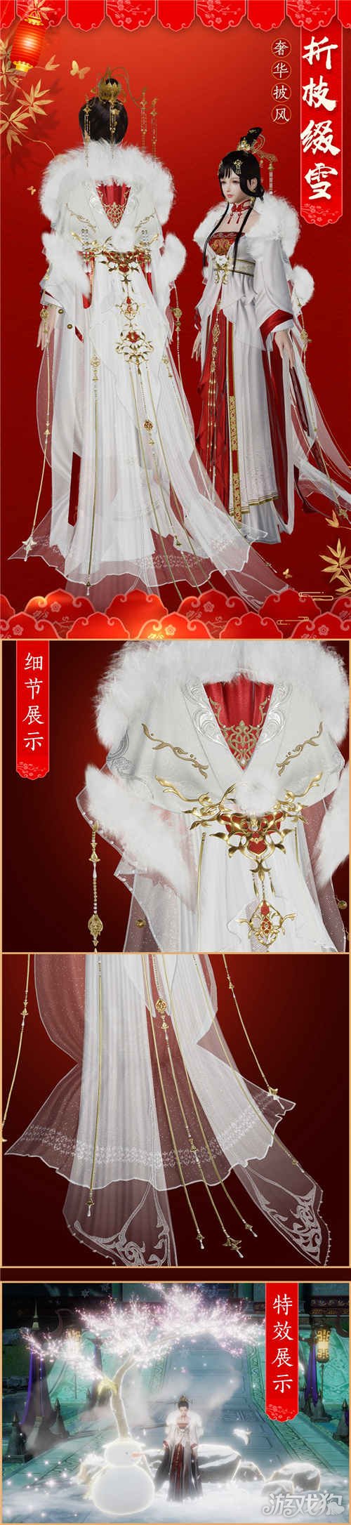 “积雪飞花不满空,萦回庭树转疏红。白色款奢华披风·折枝缀雪,采用绸缎、皮草、轻薄纱幔等诸多高档材质加以缝制,并辅以精致金饰点缀,搭配莹莹亮片,呈现如银河般璀璨的魅力!在施展特效后,雪地凭现,红梅渐开,鸾鸟飞舞,雪人可爱,多种元素汇集,勾勒出一副和谐的冬日绘卷!