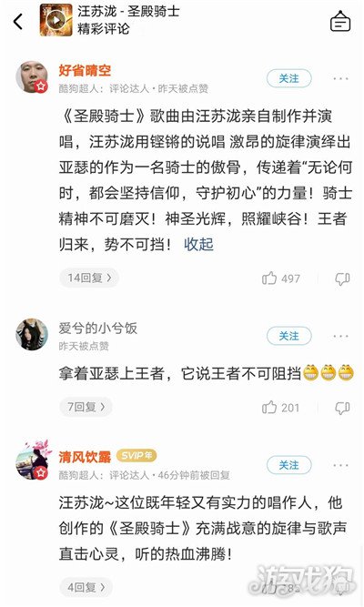 歌曲《圣殿骑士》在酷狗音乐一上线,就引发歌迷如潮好评,直接冲进酷狗TOP500榜单前50,近两万的评论数据足以说明汪苏泷的实力以及歌曲的魅力。“听圣殿骑士我能用亚瑟五杀!太厉害了!”、“汪苏泷唱出了亚瑟的胆量和守护,希望我们都能成为那样勇敢的人!”