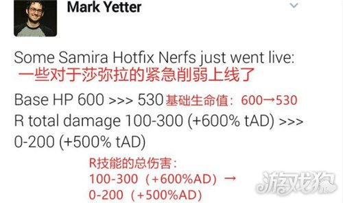 莎弥拉上线后很多主 播以及职业选手都是试玩了,结果就是发现这个英雄是真的强,伤害简直就是高的离谱了。看小天还有姿态玩这个英雄基本都是在乱杀,于是设计师也是坐不住了,直接对莎弥拉来了个紧急削弱。