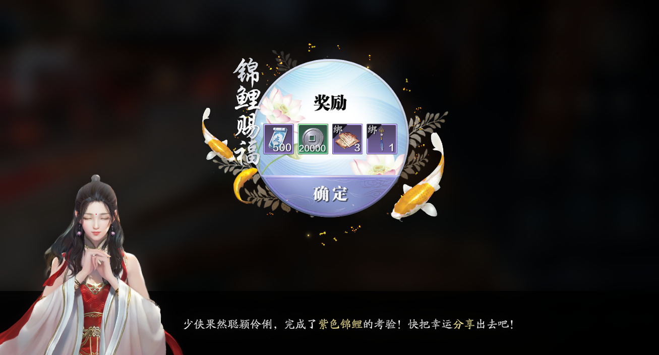 完成四件珍宝的找寻之后,回到开封与朱小月一番交谈即可完成该锦鲤任务,奖励为500绑点、2万碎银、3张绝品心法残页、腰饰垂秀缨·蓝(魅力值+15)。