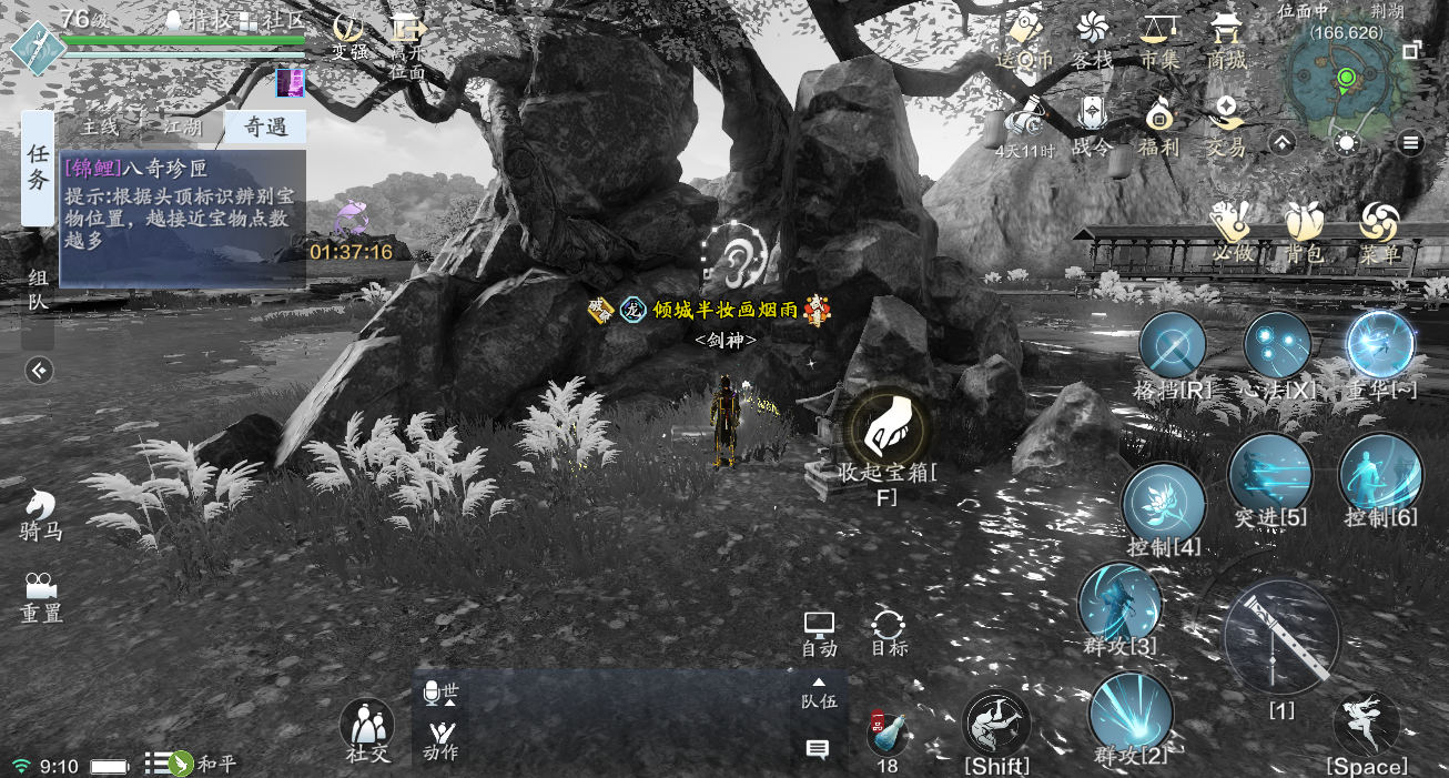 坐标为[荆湖(166,626)],位于荆湖秋月泽区域正中的大树、假山下。