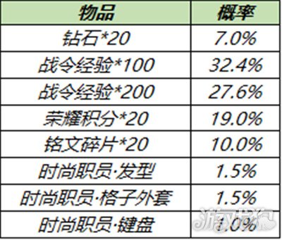 打开可随机获得以下奖励之一:时尚职员·发型、时尚职员·格子外套、时尚职员·键盘、荣耀积分*20、100/200战令经验、钻石*20、铭文碎片*20。