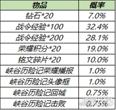 打开可随机获得以下奖励之一:峡谷历险记头像框、峡谷历险记荣耀播报(永久)、峡谷历险记回城(永久)、峡谷历险记击败(永久)、荣耀积分*20、100/200战令经验、钻石*20、铭文碎片*20。