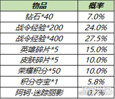 打开可随机获得以下奖励之一:阿轲-迷踪丽影、积分夺宝抵用券*1、英雄碎片*5、皮肤碎片*5、荣耀积分*50、200/400战令经验、钻石*40。