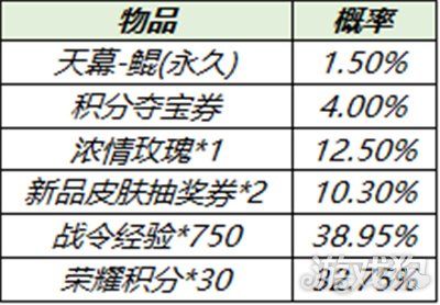 购买红蓝对决(1日),可额外随机获得以下之一:永久天幕-鲲(开启100次以内必得)、积分夺宝券、浓情玫瑰*1、新品皮肤抽奖券*2、战令经验*750、荣耀积分*30。