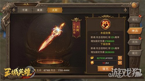 神兵太阿:可使用材料进行升级,获得加成属性以及断魂技能。(断魂:攻击飞升怪物时,有概率增加固定伤害)