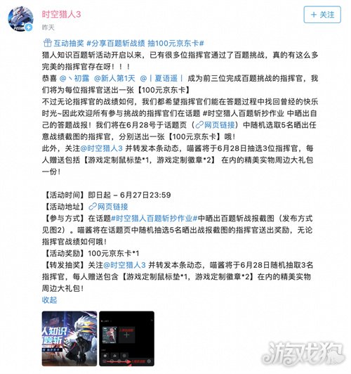 参与抽奖的方式也特别简单,只要在游戏官方B站账号话题#时空猎人百题斩抄作业中晒出自己的答题战报就自动获得参与资格,就有机会成为5名幸运指挥官中的一员,获得100元京东卡特别奖励。另外,只要关注游戏官方B站账号【时空猎人3】并且转发指定的活动动态,就有机会成为被官方抽中,免费领取时空猎人3实物周边礼包。