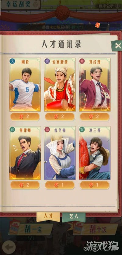 开局幸运刮奖会赠送一张引荐卡,人才引荐卡很重要,一定要留着两张再进行兑换,因为前期兑换紫色卓越品质的人才/艺人性价比较低。而第二张人才引荐卡可以通过抽取或者引荐卡碎片合成,第一次兑换推荐【郑经理】,可以增加两次广场斗鸡活动次数,性价比高。
