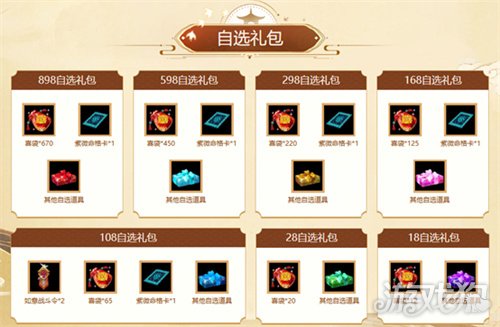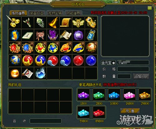 玩家可以根据自己的游戏需求,选择自选礼包商城里的物品,自由搭配同种类的道具,只要所选道具的价值满足相应“自选礼包类型”的要求,当价格达到1800元宝、2800元宝、10800元宝等不同档次时,就可以将所选道具打包成相应的礼包,并且还能获得相应的赠品。