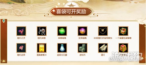 本次活动中,喜袋是玩家们获取丰厚奖励的重要途径之一。喜袋中藏有丰富的奖励,包括随机元灵(元灵种类包括赤天、混沌、笛舞、降魔、夫诸、震魃等)、随机神兽、变异、神兽精魄、变异精魄、满属性装备箱、80级随机所有相首饰、道具套餐卡、商城道具、道行、游戏币等。但本月从喜袋中获得的道行奖励达到500次上限后,再使用喜袋开出道行奖励时将自动转换为经验奖励。