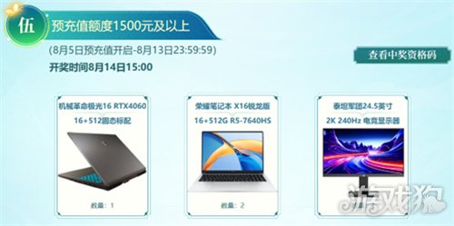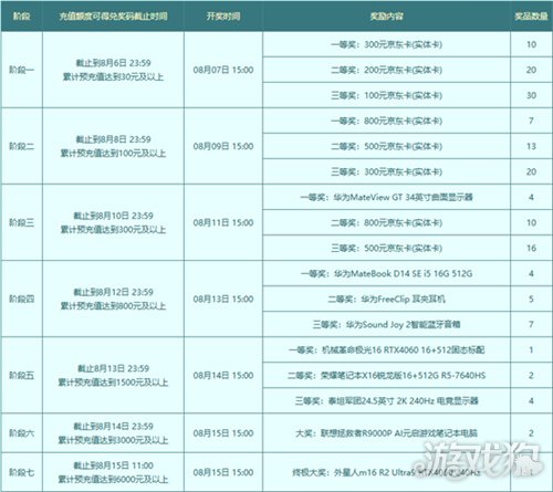 七个阶段为分阶段开奖,目前活动已经达到第五阶段,想要参与第五阶段的玩家需要在8月13日之前在新服累计预充值达到1500元及以上即可获得该阶段的抽奖码来参与抽奖。奖池内大奖多多,千万不要错过哟!