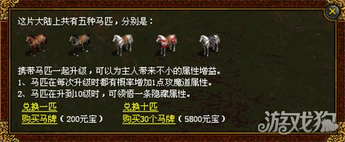 由于版本设定的原因,《名扬传世2003》中没有骑战系统,但玩家仍然可以体验坐骑和骑兵竞技玩法。使用马牌兑换坐骑时,会在5种品质的坐骑中随机获取一个,和坐骑朝夕相处,打怪喂养就会慢慢为它增加经验升级,将最开始的白板属性逐渐增加自身职业对应的攻魔道上下限。坐骑达到10级上限后,还能获得一条隐藏属性,这个属性与坐骑的品质无关,如果运气好,甚至可能得到最好马的待遇呢。同时,坐骑也支持合成玩法来提升品阶。