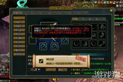 转生后玩家可以在鬼斧神工炼化紫属性界面对大于等于180级的绿装备每次使用一个五行精粹和一个先天精华进行炼化紫属性操作。炼化紫属性可使装备拥有一条基于套装属性的明属性和一条成套生效的暗属性。