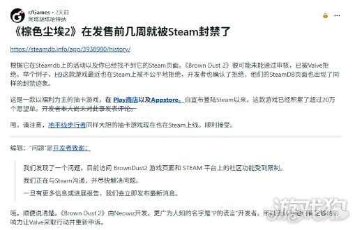 游戏发行方Neowiz已就此发表官方说明,确认Steam对游戏页面及社区功能进行了限制:“我们发现了一个问题,导致目前《棕色尘埃2》的 Steam 商店页面及社区功能受到限制。我们已与 Steam 保持沟通,并正努力尽快解决问题。一旦有最新进展,我们将及时告知。感谢大家的理解。”