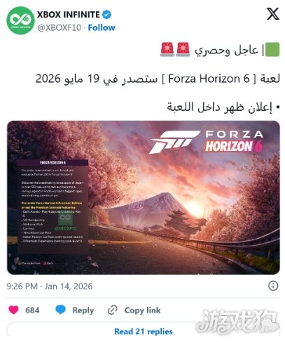 沙特阿拉伯Xbox新闻网站Xbox Infinite发布了一张他们声称出现在“游戏内”的公告图片。公告称游戏的高级版将让玩家提前体验游戏,允许玩家“从 5月15日开始提前4天游玩”,这意味着《极限竞速:地平线6》的正式发售日期为5月19日。