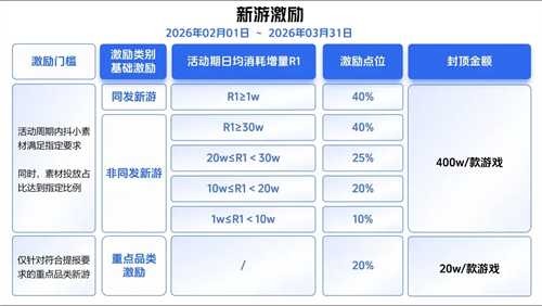 巨量引擎本轮激励政策的一个显著导向,是向 “同发新游” 提供了极具竞争力的扶持条件。对于选择将抖音作为首发或同步首发平台的小游戏产品,政策设定了更具吸引力的启动激励:活动期内抖音小游戏素材满足指定要求,只需日均消耗增量达到1万元,即可获得40%的激励点位,且在过程指标上要求更为简化。这为开发者在新品关键启动期,大幅降低了在抖音生态进行重点投放与测试验证的成本门槛。