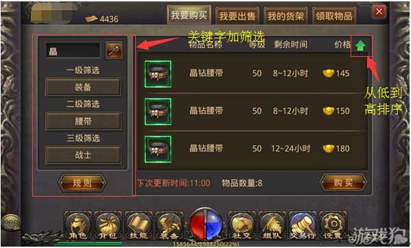 一进交易行,满眼都是99999999元宝的物品,什么火墙秘籍、中型盔甲、修罗这些不值钱的物品占满了整个界面,这种无聊的物品真是让人抓狂,这个时候。我们就必须得用到关键字加筛选功能搜索,先输入关键字:如果要搜索战士的三件套之“晶钻腰带”则只需要输入“晶”1个字,点击输入框右边的搜索按钮,就直接搜索到了所有跟晶钻有关的物品。此时,我们再通过“装备→腰带→战士”,这样就可以筛选出所有“晶钻腰带”