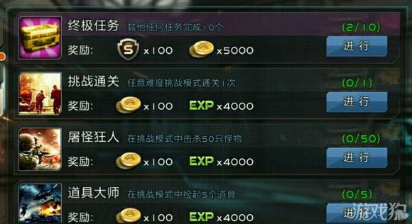 全民枪战手机党省流量做任务教程,小编的目标就是用最少的流量做完10个任务拿取每日终极任务大奖(只做10个任务因为省流量嘛),步骤:1.做挑战 3个任务:做挑战,菜鸟模式也可以。你只需在游戏中杀死50个怪顺便拿取5个道具箱并且顺利通关就能一次性完成3个任务(挑战通关、屠怪狂人、道具大师)就能得到300金币和12000点经验 [当然老兵技术好还可以在挑战里打出勋章赢唯我独尊任务]。