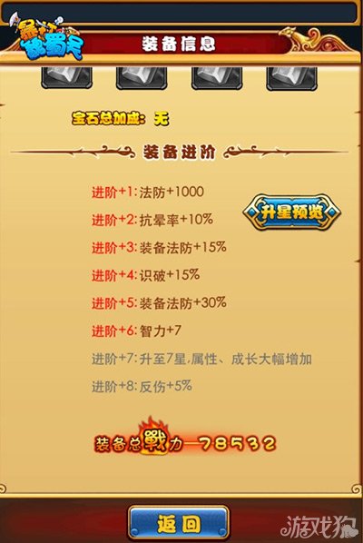 武将进阶咯不但外形变大显得彪悍,同时属性也会有很大的提升,那我们的装备进阶也要紧跟步伐啊,不能被甩太远啊,装备同样的也可以进阶升星,6到7。而且如果你进阶的部位不同,那么增加的属性也不同,当然效果也会有所差别,举个例子吧,下图中的是反伤效果,如果对面有高爆发的脆皮武将,那么就会造成双双打残的效果,这就要看双方的布阵功底咯。