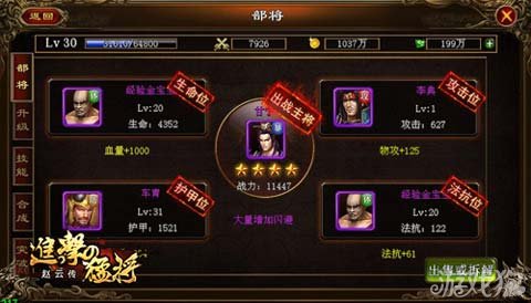 部将系统分为部将、升级、技能、合成、突破等功能。部将功能里有五大列阵,在列阵中有主将位、生命位、攻击位、护甲位、法抗位,玩家们可根据其收集到的部将属性特长,将每个部将安置在最合适的位置,合理搭配,即可发挥出最强战力!