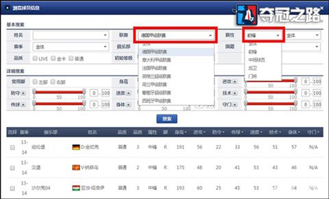 在球探手册中,采取智能化页面设置,后台处理玩家查找请求,只要输入球员姓名,就可一键搜索这名球星的一切资料。或者输入满足相关范围条件,便可一键查询满足此条件的所球星,并对其属性资料进行罗列。例如,玩家想找在德甲联赛中,踢前锋位置的相关球员,只要在联赛列表中选择“德国甲级联赛”,在属性列表中选择“前锋”,点击搜索按钮,页面会自动显示出9页满足这两项条件的所有球员属性,而且这些球员各项能力值也一并显示。对于显示出来的球员,系统还提供排序标准,让玩家的查找更加便利迅捷。