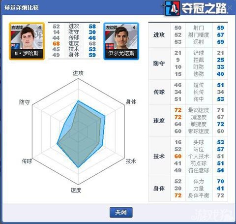 球探手册同时还提供球员比较功能。例如在常规联赛中,赛前有“对阵实力”比较,要想比较两队中主力球员的详细属性,就可以用过球探手册的比较功能来实现。通过找出两个要比较的球员,点击“比较选择球员”按钮,相关球员的各项能力值,便以六边形图叠加的方式显现出来,孰强孰胜让玩家一目了然。