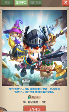 一关之后又一关,塔防之后是何物,塔防骑士团无尽守卫模式征集塔防强者在无尽的挑战中验证自己,在无尽的试炼中成就自我。 无尽守卫模式火力全开已经就绪。无尽守卫模式在玩家达到6级时开启,玩家每天可以参加2次无尽守卫模式哦,每次需要消耗10体力。点击“守卫”选择“无尽守卫”即可。总共40波的怪物对玩家的战力要求会更高,所以在战斗时英雄与机关的搭配,辅佐全体技能的释放才能击败更多的怪物。 无尽守卫模式的乐趣正是这不断提升的游戏难度,对玩家战力的锤炼以及对玩家战术的考验,值得一战。