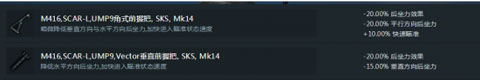 可以看到数据方面两者还是有差异的:两种握把都可以减小 20%的后坐力效果,区别在于直角握把减小20%的平行方向后坐力,而垂直握把减小的是15%的垂直方向后坐力。这里有一点需要说明,其实两种握把都具有提高10%的快速瞄准性能,只是从一开始开发商的数据就出现了差错,导致目前几乎所有的垂直握把数据中都丢失了这一项。