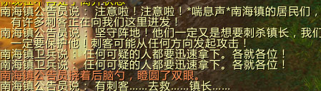 某天早上,因为炉石定在南海镇,无意中从酒馆出来,发现出现黄字了,NPC在喊话,运气非常好,事件发生了!首先NPC会喊话,如下图,然后整个镇子如临大敌,开始警戒。