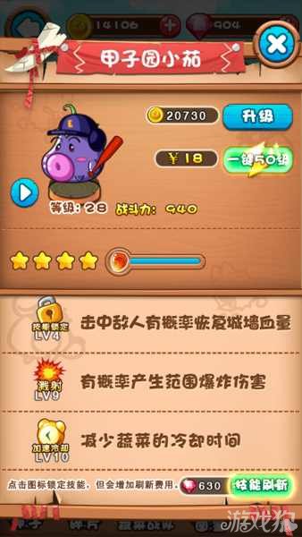 燃烧的蔬菜甲子园茄子如何发挥出最大威力,在游戏的进击中蔬菜是最重要的元素。茄子的最终形态是四星级的甲子园小茄子。威力绝对不可小觑。他拥有特殊的回旋和贯穿的技能。能穿过最前的阻挡攻击到最后的入侵。对于这个特征一定要好好地利用。我们可以通过金币的不断升级达到满级的最强状态。 茄子不但可以直接击中造成伤害,还有可能产生小范围的爆炸,造成群攻击伤害。在攻击发射的的时候,可以横着通过反折的方式发射。就可以贯穿整个入侵的群体。 产生小范围的爆炸,看到那些入侵者被击败的样子是不是爽翻了呢。