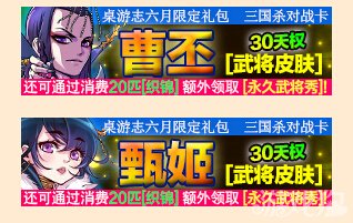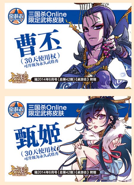 一、三国杀对战卡曹丕、甄姬武将皮肤(30天权)随2014年6月号《桌游志》附赠,玩家可以从杂志中随机获得一张武将皮肤兑换卡(曹丕或甄姬),凭卡上的刮刮码,可以在《三国杀Online》礼包中兑换对应的武将皮肤,每张卡限领一次,领取的武将皮肤为30天使用权。