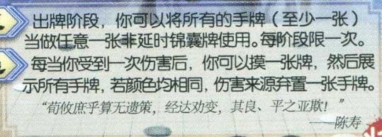 若要挑刺的话,在官方设计武将体系中,典型魏国谋士如郭嘉、荀彧是以卖血补牌为特色,典型蜀国谋士如小诸葛、黄月英、庞统以锦囊为特色。淬毒的荀攸是锦囊流,偏向蜀国谋士风格。但为了体现荀攸计谋百出,这个锦囊流的【奇策】是可以接受的。另外,《魏书》“攸深密有智防”,这里倒是个暴露狂,智防倒是没了。
