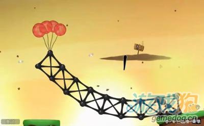 思路简单,搭塔为桥,塔倾为桥。难点在于桥离下一个岛太远,而粘粘又有限,只有把桥的基部往右移,才能够达到对面的小岛,依照空中的风车轮的思路,利用气球拖拽形成的作用力把桥基部向右移动,气球拖拽的位置应该在靠近桥基,桥就成功地搭好了。
