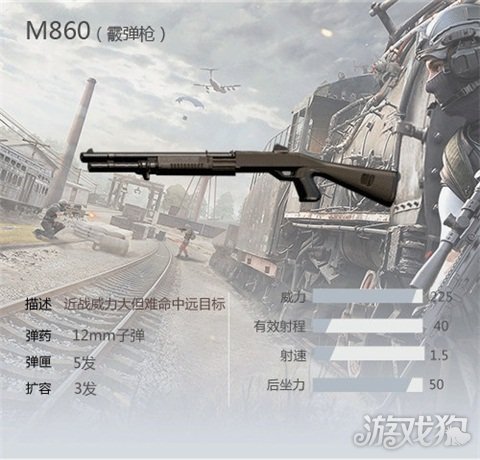 这把枪的定位主要用于强有力的近距离作战武器,以超高伤害著称。M860霰弹枪也就是我们常说单喷,射速1.5、射程40、弹容量5、使用12号口径霰弹,可安装霰弹枪补偿器,安装后后坐力降低为42.5,总体来看这是一把射速慢、射程短、弹容量小,后坐力大的枪。虽然有诸多的缺点与不足,但是这把枪却拥有者全荒野里最高的伤害值。