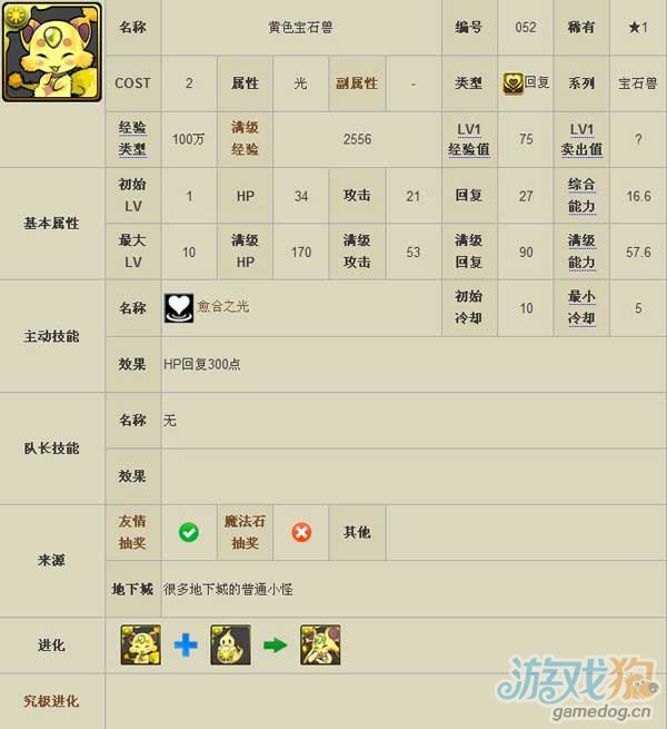 黄色宝石兽是光属性的宠物,主动技能为愈合之光,效果是HP回复300点,队长技能无,更详细的资料请看下面的介绍。 宠物名称:黄色宝石兽 宠物属性:光 宠物技能:愈合之光 队长技能:无 获得方式:抽奖获得 高清截图: 资料截图: